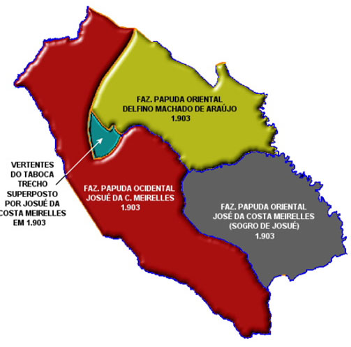 A figura 9 abaixo mostra os limites constantes da transcrição de nº. 27 de 31/05/1902, em nome de Delfino Machado de Araújo e os limites descritos unilateralmente por Josué da Costa Meirelles em 11/07/1903. A área conhecida como Vertentes do Ribeirão Taboca foi indevidamente transferida do lado oriental para o lado ocidental da Fazenda Papuda.