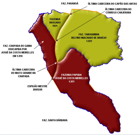 Fig. 3 – Divisão da antiga Fazenda Papuda, segundo os termos da Escritura Pública de Divisão e Limitação datada de 23/06/1900 firmada entre os proprietários José de Campos Meirelles e Josué da Costa Meirelles.